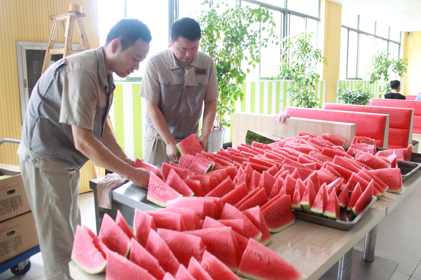 開餐時間到了,員工陸續來到餐廳,帶著一身暑氣,拿起西瓜咬了一口,從他們豆大汗珠的臉上,能感受到那份幸福與清涼。